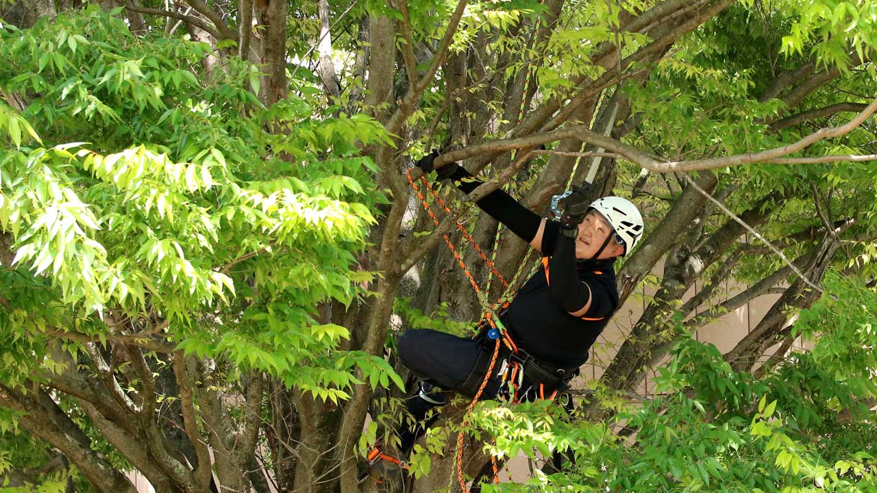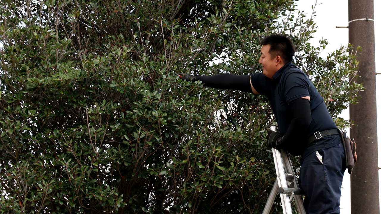 高木剪定に関してもいままでは高所作業車が必要とされておりましたが「ツリークライミング」という手法(安全装置を身体につけ、木に登って剪定を行う手法)を取り入れ、高所作業車が入れずに剪定しづらかった場所での剪定を可能にしています。また、機械の電動化を進め、お客さまに負担がかからない形での作業をおこなうようにしています。
